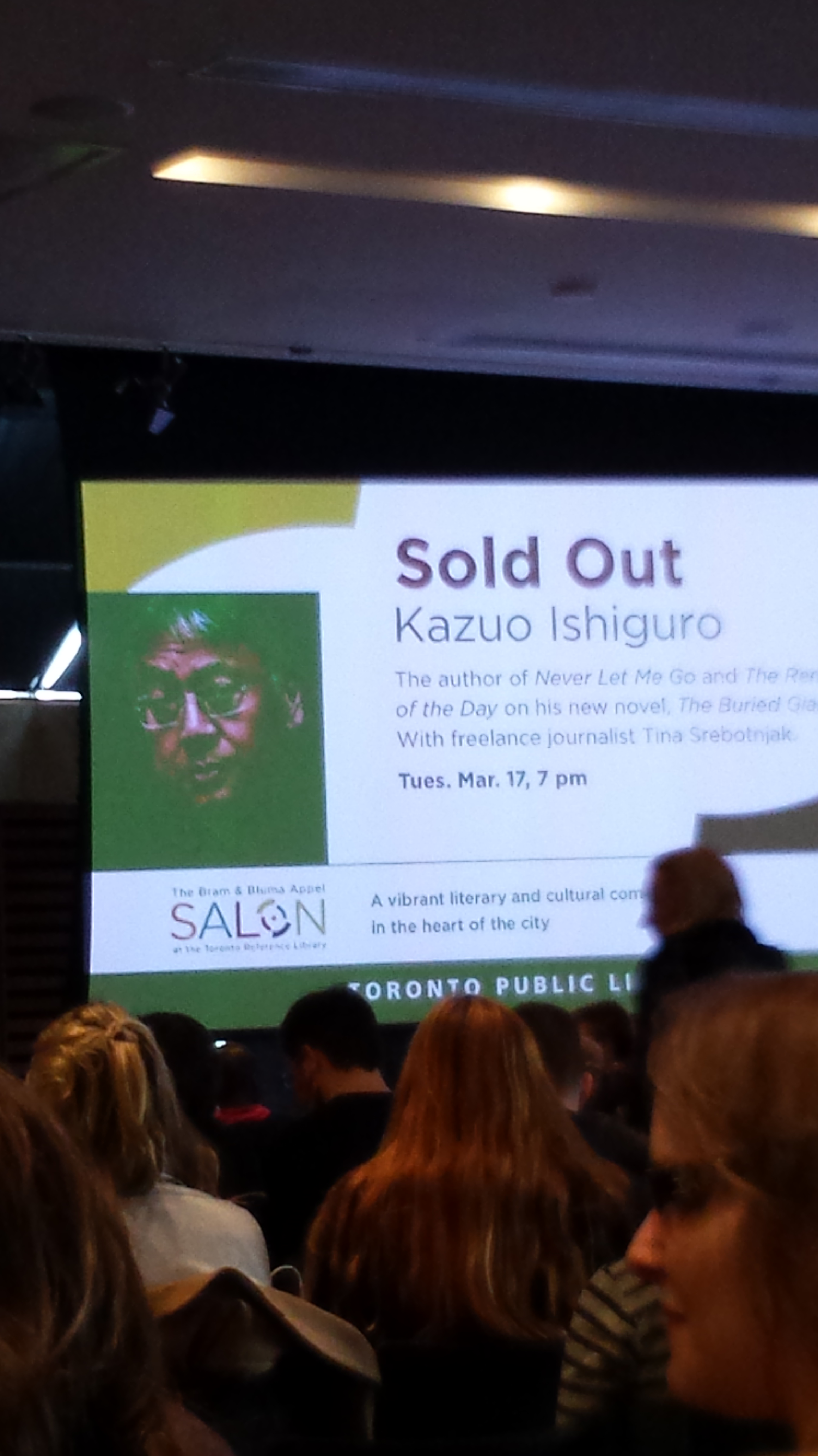 So in place of Funky Cover Friday this week, I want to share with you some of the pictures I took at the book launch for Kazuo Ishiguro’s The Buried Giant that took place at the Toronto Reference Library earlier this week. It was a sold out event and it’s no wonder why. Kazuo is a talented author and an incredibly well-read, well-spoken, fascinating man. He spoke a lot about memory in his on-stage interview. Memory is a concept close to his heart and it’s something he’s clearly passionate about. It features in many of his stories as he often poses the question: is it better to remember so the awful past doesn’t come back to haunt us, or is it better to forget and risk damning ourselves over again. His talk was absolutely fantastic.
